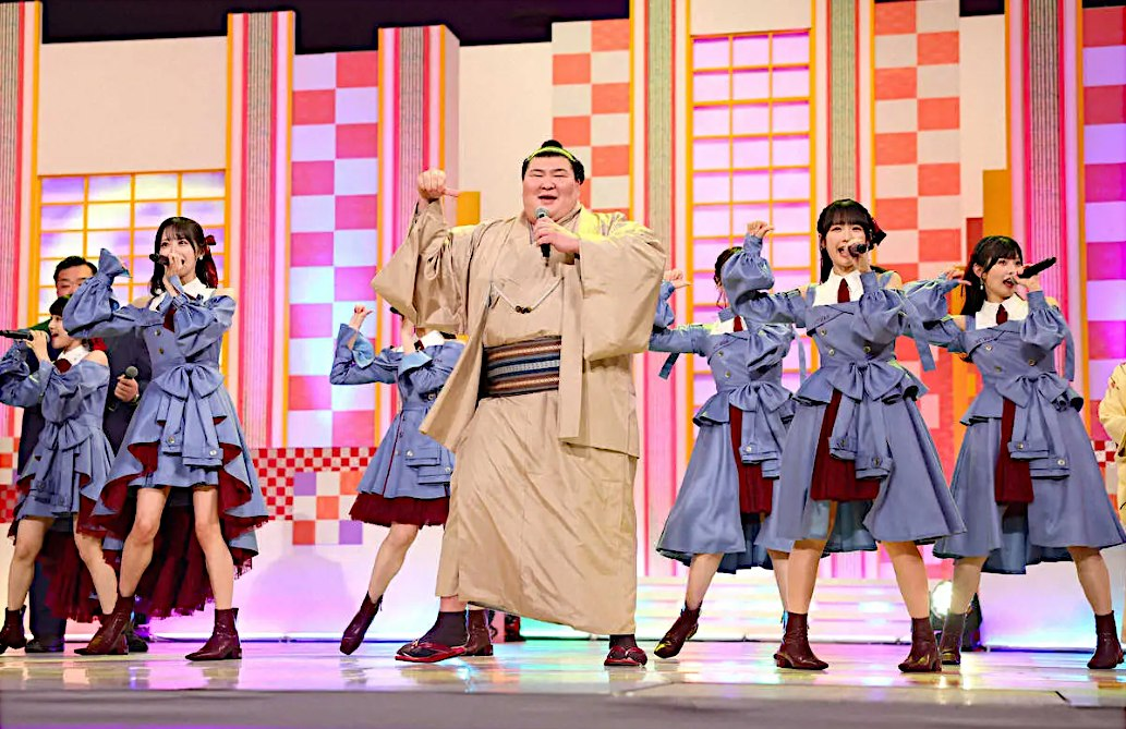I’m just going to put it bluntly: the One day Tournament was not exciting. Hiradoumi had a few fun bouts and got the honorary Fighting Spirit Prize; Abi and Hoshoryu made it to the end and Hoshoryu took him out for the prize of 2,500,000 yen. The break between Juryo and Makuuchi was actually the most exciting part; ex-Maegashira Aoiyama and eternally balding ex-Maegashira Hokutofuji went back to the dohyo for an exhibition bout. In the NHK Charity events, there was some shokkiri (funny sumo) and really not much else. The highlight was Atamifuji’s performance alongside J-pop girl group STU48. This picture, I think, really sums up Atamifuji very well. He looks so out of place, and yet… so right.