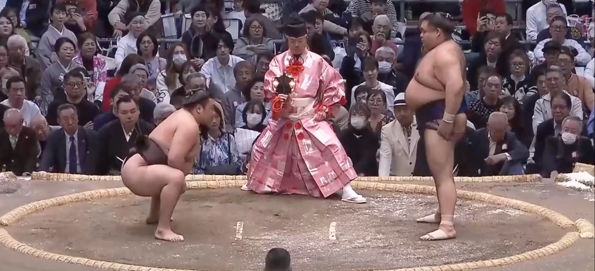 PINK MAWASHI DAY EIGHT: This is what we call URA-ZUMO!! The Nakabi magic is in the air, and Ura was happy to be in his hometown on his favorite day of the basho. Roga, like all wrestlers in Osaka, felt a bit uncomfortable against the hometown hero. However, Roga went into it with a positive attitude and a lot of tsuppari. He forced a flailing Ura to the edge, and Ura locked eyes with the extremely cute toddler with an Ura towel, then with eager Ichiyamamoto. Actually, he didn’t, but he did throw Roga in a beautiful shitatenage. Ichi was thrilled, and Ura did a little fist pump as he jogged back to his place.